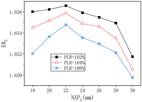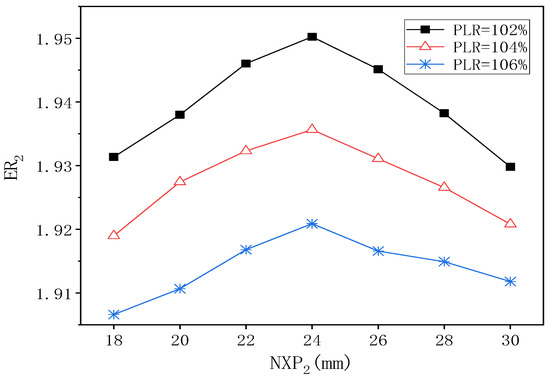 Figure 20 demonstrates the influence of NXP2 on ER2 under different PLR when PNTD2 is 4.7 mm. When PLR is 102%, as NXP2 changes from 18 mm to 24 mm, ER2 rises from 1.932 to 1.950, and then decreases to 1.929 when NXP2 is 30 mm, and the maximum deviation of ER2 is 1.057%. When PLR is 104%, the change trend of ER2 also increases first and then decreases, and its peak value of 1.936 appears at the value of 24 mm of NXP2, while the maximum deviation of ER2 is 0.868%. When PLR is 106%, the variation trend of ER2 is similar to the previous two, and its maximum value of 1.921 is obtained at NXP2 = 24 mm, and the maximum deviation of ER2 is 0.744%. Therefore, when PNTD2 is 4.7 mm, the optimal value of NXP2 is 24 mm, which does not change with the change of PLR.