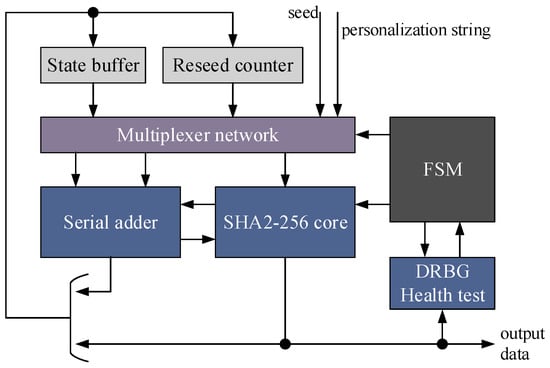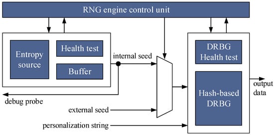 The choice of a hash-based mechanism for the implementation of the DRBG module can be found in the work presented in the publications [,], in which they have investigated the structures and the characteristics in terms of security and performance of the implementation approach specified by the NIST standard for the construction of cryptographically secure deterministic RBGs, i.e., []. We propose and specify the following three main architectures: