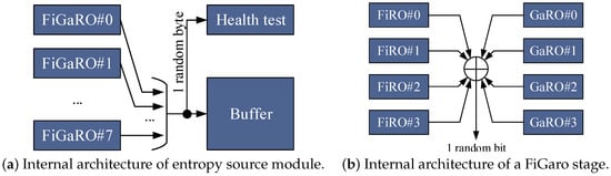 Concerning the entropy source module, its development was guided by the purpose of implementing a digital design featuring the highest level of entropy, and that was portable on a variety of technologies, exploiting the properties of HDL digital designs. As shown in [], such design activity starts with the analysis (and the comparison) of the available solutions, which all rely on the usage of ROs for the generation of entropy. A RO essentially consists of a chain of combinational logic gates and cells that closes on itself, forming a circle, or a loop, in which the output of the last element corresponds also to the input of the first element of the chain. The output of the last element of the chain is used also as the output of the RO, and it oscillates between two voltage levels corresponding to the logic states low (or 0) and high (or 1). The characteristics of the oscillation depend on the topology of the combinational loop and the logic cells used to build it. Based on this, different approaches can be used to exploit some intrinsic physical phenomena such as temperature, voltage, or noise fluctuations to randomize the oscillation and thus generate a random sequence of 0 s and 1 s by sampling the output of the RO. The most diffused and main solutions are Transition Effect Ring Oscillator (TERO), originally proposed in [], Metastable Ring Oscillator (Meta-RO), proposed for the first time in [], Fibonacci Ring Oscillator (FiRO), and Galois Ring Oscillator (GaRO), illustrated in [] and Fibonacci-Galois Ring Oscillator (FiGaRO), which is a combination of the last two previous candidates, and it is described, for example, in [].