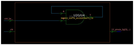 Combining the information in Table 2 with the schematic in Figure 5, it derives that when input B is 0, the signal on port Y is forced to the high logic level (1), whatever the initial value of port A, and it remains on that logic level, because due to the feedback wire, the value of Y is applied also to port A, and when and , (Table 2). In other words, when the module in Figure 5 is disabled (i.e., B which is connected and corresponds to the module enable signal, ctrl_1e__, is zero), the loop does not oscillate and the output of the module (Y) is stable to the logic value 1. On the other hand, when the module in Figure 5 is enabled (i.e., ctrl_1e__ ), the oscillation is triggered and the output Y starts to bounce between the logic states 0 and 1. Assuming for instance, Y becomes 0 (case and in Table 2), and this value is transmitted to port A, which moves to the low logic value, too. Now that , Y moves to the logic value 1 (case and in Table 2); thus, also, A assumes again the high logic state, and the cycle starts again from the beginning, being continuously repeated until . To resolve this issue, specific constraints have been specified relying on the set_dont_touch attribute that was integrated within the Synopsys Design Constraint (SDC) file used in the synthesis flow, to force the synthesis engine to generate a netlist as close as possible to the one in Figure 4 and described accordingly in the RTL code of the RNG. An example of the results of this strategy is illustrated in Figure 6.