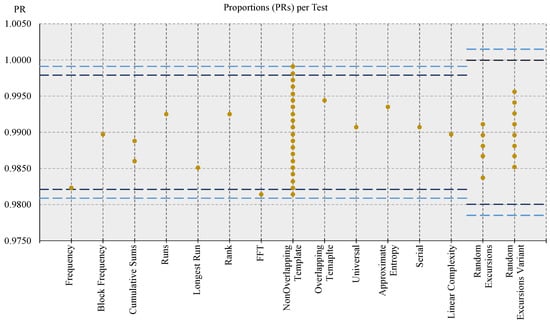 Graph of NIST STS PR metric results for tested DRBG sequences. The dark golden points represent the PR values for each test, or sub-test, and the blue dashed lines represent the boundaries of the confidence interval(s): it the PR value lies outside the confidence interval(s), the test is failed: three (six) failing tests are tolerated for the widest (narrowest) confidence interval.
