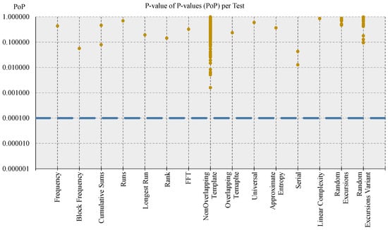 Referring to Figure 7, the dark golden dots represent the PR values for each test, while the blue dashed lines represent the upper and lower limits of the confidence interval used to determine if a sequence passed a test: the light blue ones delimit the confidence interval deriving from the original formula of NIST SP 800-22, i.e., the one with the value 3 for the constant, and the dark blue ones delimit the corresponding confidence interval using a value of 2.6 for the constant in the formula, according to []. Interpreting the graphical representation of results, on one hand, multiple dark golden dots (i.e., PR values) on the same vertical line means that the corresponding test is composed of multiple sub-tests, and the outcome of each of them is reported; on the other one, it can be noted also that some of the tested sequences failed some of the test (i.e., the associated dark golden dot lies outside the confidence interval). This must not be interpreted as a failure of the NIST STS testing procedure, because, according to [], a certain number of failing tests can be tolerated without affecting the outcome of the experiment. The number of tolerated failing tests is three (or six) when referring to a confidence interval computed using a constant value of 3 (or 2.6). In the former case, no test (0) exceeded the limit of the confidence interval related to the constant value of 3, while in the latter case, only five tests lie outside the confidence interval related to the constant value of 2.6; hence, the final result is that the tested sequences successfully passed the NIST STS tests, according to the proportion metric. The same graphical representation approach applies also to Figure 8, showing that the PoP values (dark golden dots) of all tests are greater than the threshold of (dashed light blue line) used for the pass–fail criterium, indicating the distributions of p-values were shown to be uniform, as illustrated by Figure 9.