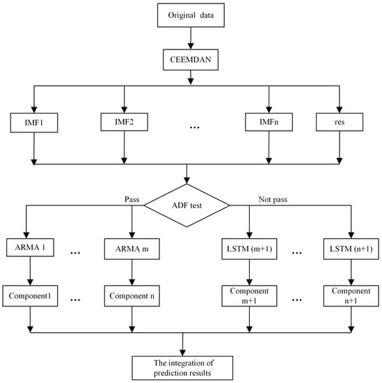 To sum up, the CAL model prediction consists of time series decomposition, an ADF stationary test, model fitting, and integration of results. Figure 1 shows the prediction model, where IMF-IMF are IMF components after time series decomposition, and is the residue. ARMA-ARMA denote that the m sequences pass the ADF test and are fitted using ARMA, and LSTM-LSTM denote the sequences that fail the ADF test and are modeled by LSTM. The steps of the proposed hybrid model are as follows.
