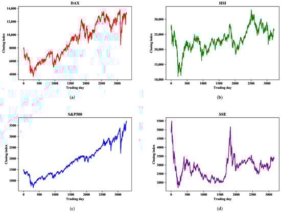 We use one-step-ahead prediction to verify the prediction accuracy of the proposed CAL model on four major global stock indices: Deutscher Aktien (DAX), Hang Seng (HSI), Standard and Poor’s 500 (S&P500), and Shanghai Stock Exchange Composite (SSE). These have strong representation in the global financial market and can reflect stock market changes, which has much research value. Stock market indices are affected by national policies, market environments, and other factors presenting different characteristics. Research on stock market indices in different financial markets can examine the prediction accuracy of the model.