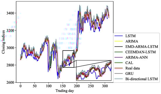 Figure 2c shows that the movement trend of S&P500 is relatively stable, with little fluctuation in the research interval, and an overall upward trend. Hence, the predicted results are closer to the observed values of stock indices. Table 6 shows the experimental results of S&P500. The data show that the CAL model yields the smallest prediction error, with MAE 48.84% less than LSTM and 49.75% less than ARIMA. This shows that the single model has better prediction performance in some stable time series sets, but there is still room for improvement. However, GRU and Bi-LSTM cannot effectively improve the prediction accuracy. The prediction effect of EMD-ARMA-LSTM is still inferior to that of CAL, which further demonstrates the superiority of CEEMDAN over EMD data decomposition. CEEMDAN-LSTM achieves better prediction performance than the single LSTM model, and ARIMA-ANN yields higher prediction accuracy than ARIAM, showing that sequence decomposition and model combination can improve the prediction accuracy of financial series.