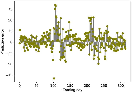 As demonstrated in Figure 5, we zoom in a part of the prediction interval to observe the consistency between the real and predicted values of different models. It can be seen that the CAL model yields the closest prediction results, and CEEMDAN-LSTM is closer to the observed values in comparison with EMD-ARMA-LSTM and ARIAM. LSTM and GRU have larger volatility and prediction error than the other models. The stem diagram oscillates up and down around the zero axis in Figure 6 and is locally symmetrical concerning the zero axis, indicating that the prediction results of the CAL model are relatively stable within the prediction interval.