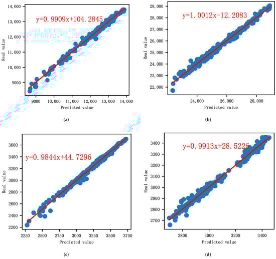 Here, is the standard deviation of the predicted values, n is the number of the predicted (or real) values, is the mean of the predicted values, and is the mean of real values. Table 8 lists the regression parameters and diagnostics results. It is observed that the slope a of each stock index is close to 1, the SE for a is relatively small, which means that the predicted values are very close to the real values. Furthermore, for each linear regression model, p for a is below the standard cutoff of 0.05, and t for a is high, suggesting it is a good model. In addition, Figure 7 shows the linear regression results of each stock index. The scattered points are evenly distributed near the fitting line, which indicates that the predicted and real values are highly correlated.