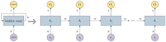 Jordan [32] first proposed the recurrent neural network in 1986, which can describe dynamic time behavior. As illustrated in Figure 2, unlike feedforward neural networks that accept inputs with a more specific structure, RNN cyclically transmits the hidden states in its own network, so it can accept a wider range of time series inputs: