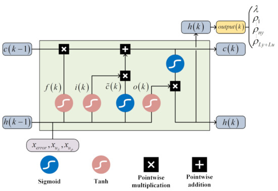 where , and are the weight coefficients and is the sigmoid activation function. In contrast to Equation (17), / is a polynomial including forget gate , whose value range at any time may be distributed between 0 and 1 or greater than 1. As time step t increases, it is not guaranteed that / will converge to zero or infinity, which can avoid gradient vanishing and gradient exploding in RNN. Therefore, LSTMs are introduced to complete the parameters adjustment work of and online, and the architecture of the parameters online adjustment module based on LSTMs is shown in Figure 4.