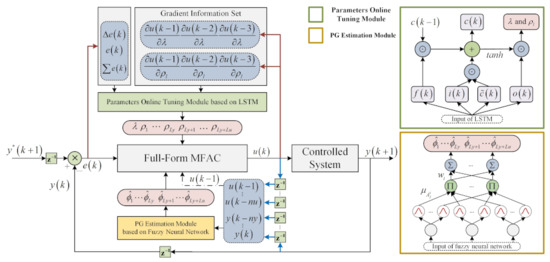 This study set out to adjust several vital parameters and of the FFMFAC online and accurately estimate values in the PG vector, an enhanced FFMFAC is proposed. The general framework is illustrated in Figure 6. The left sub-figure is the general architecture of the proposed algorithm. The upper and lower sub-figures on the right represent the online parameter adjustment module and the PG estimation module. With the current time set to time k, EFFMFAC utilizes the current and past I/O information vector of the controlled system as FNNs input and they complete the online estimation of PG values online. The LSTM then takes the set containing the system error information and gradient information as input to perform the online adjustment of vital parameters in FFMFAC. Finally, based on PG estimated values and adjusted parameters, the input signal and the output are obtained: