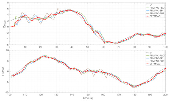 According to the experimental results listed in Table 3, the gap between the indicators of all algorithms is relatively small. FFMFAC has the worst performance on , and , while FFMFAC-PSO has the worst performance on and . Compared with FFMFAC, the tracking performance of FFMFAC-BP has improved in all indicators except , and FFMFAC-RBF has achieved better results in all indices.