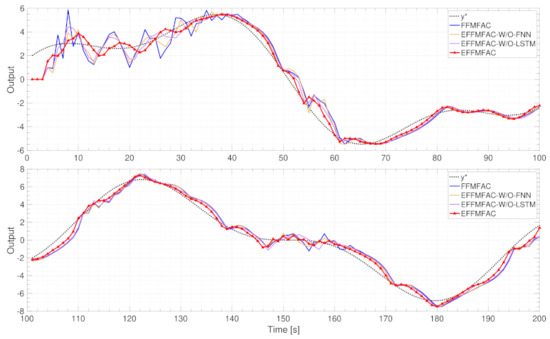 Aiming to prove the validity of vital parameters’ online adjustment and PG values estimation in this simulation, ablation analysis was carried out. Similarly to the SISO discrete nonlinear system simulation, two temporary EFFMFAC-W/O-LSTM and EFFMFAC were introduced as comparison methods. The tracking curves for these four methods, together with the original FFMFAC, are displayed in Figure 14.