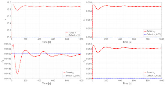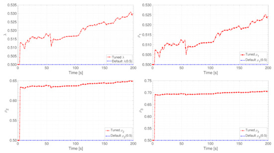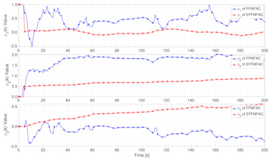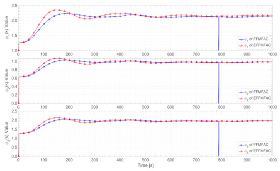 The results of the online adjustment of parameters and are shown in Figure 15. As illustrated in these four sub-figures, the EFFMFAC can sensitively adjust these vital parameters in real-time. In addition, the adjusted parameter values are in the same order of magnitude as the default parameter values, and the difference between the values is small, ensuring the validity of online parameters adjustment.