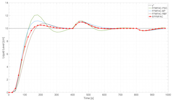 In the experimental part, a single-input–single-output (SISO) discrete nonlinear system simulation and a three-tank system simulation were carried out to demonstrate the effectiveness and applicability of EFFMFAC. All tested methods involved in these two simulations are FFMFAC [38], PSO-based FFMFAC [25], BP-based FFMFAC [24], RBF-based FFMFAC [23] and the proposed FFMFAC, which are denoted by the following abbreviations for the sake of brevity: FFMFAC, FFMFAC-PSO, FFMFAC-BP, FFMFAC-RBF and EFFMFAC.