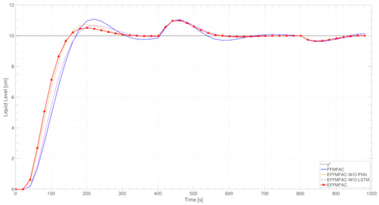 In general, the EFFMFAC outperforms all other tested methods in this three-tank system simulation. All of the figures illustrated above can prove that both the FNN-based PG estimation module and the LSTM-based online parameter adjustment module can optimize FFMFAC, implying the effectiveness of all introduced neural networks. In addition, the optimization performance of PG estimation is not as good as parameter adjustment work, showing that the parameter adjustment has a more significant impact on the control performance in this simulation.