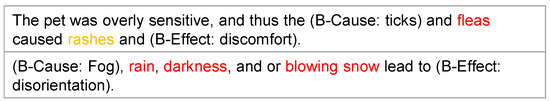 - Each word pair with a causal relationship is labeled as one of the “B-Cause”, “I-Cause”, “B-Effect”, “I-Effect”; other relationships and irrelevant words are labeled as “O”.