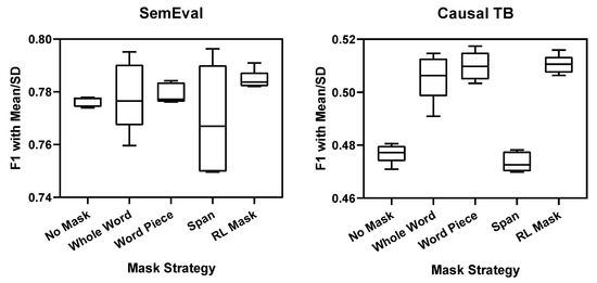 As shown in Table 3, we used three random word masking strategies to compare with our strategy. It can be seen that, although this data enhancement method has obvious effects on the Causal TB dataset, it is not effective for the SemEval dataset. It is nearly 3 points in Causal TB, and not improved in SemEval. This result shows that, in large datasets, this data augmentation method is not particularly effective. The reason is that, as many recent studies have shown, this simple noise is limited to the improvement of the model [38]. However, our reinforcement learning strategy is different from it. We use the propagation of loss to generate difficult samples to obtain better results. As you can see, our strategy has achieved the best results compared to other strategies. Even in the SemEval dataset, the best recall appears in the Whole Word strategy, but its precision is significantly reduced. This causes its F1 value to be inferior to our strategy, the same as Causal TB.