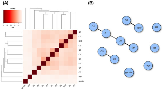 Associative patterns among 12 features of Rosenberg Self-Esteem Scale:(A) heatmap based on MCE-matrix; (B) network built with linkages with thickness proportional to one minus pairwise MCE and subject to a threshold 0.2 .