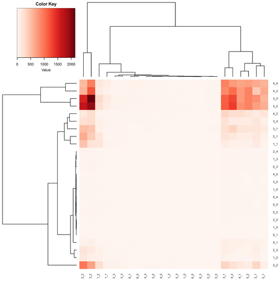 Decomposing the collection of systems defined by and into homogeneous groups in the Rosenberg Self-Esteem Scale. Bivariate-encoded -vs- systems are arranged along the column-axis, while the bivariate-encoded -vs- categories are arranged along the row-axis. An HC-tree is superimposed on the column-axis for identifying homogeneous groups of systems.