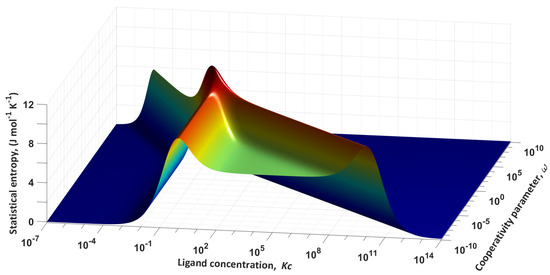 From the comparison of Figure 4 and Figure 5 follows an important conclusion that the entropy of the system is maximal at the intersection of probability densities, i.e., when corresponding events are equally probable. Equal probability means that there is no prevailing state of the system and leads to uncertainty, the quantitative measure of which is statistical entropy. In the case of negative or positive cooperativity, the processes of ligand binding depend on each other, whereas in the case of noncooperative binding these processes proceed independently. For this reason, the greatest value of entropy in the maximum (see Figure 4 and Figure 5) is observed precisely for the non-cooperative process (ω = 1).