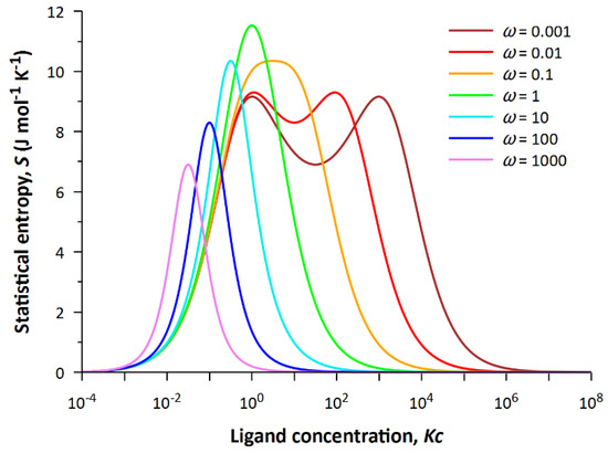 Obviously, the dependence of entropy on generalized ligand concentration turns out to be non-trivial, since it acquires two maxima instead of one at values of the cooperativity parameter ω < 1. The two maxima are due to the fact that two states at the same concentration of free ligand in solution have the same statistical weight. One of the maxima always corresponds to Kc = 1. When , the state with statistical weight ω(Kc)2 = 1 competes with the latter state.