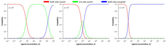 Figure 4 shows the dependencies of the probability density of the system states on Kc. If the cooperativity parameter is sufficiently small (), the three states successively replace each other. With increasing ligand concentration, the probability of the empty lattice begins to decrease, while the probability of the lattice with occupied and free sites increases. As ligand concentration continues to increase, the probability of a fully occupied lattice increases. In the limit of ω → 0, one would expect the latter event to occur at infinitely high ligand concentrations, which is impossible, and this is in perfect agreement with our ideas. Indeed, the existence of two neighboring occupied sites is prohibited in the infinitely anticooperative process (neighbor exclusion model) [50].