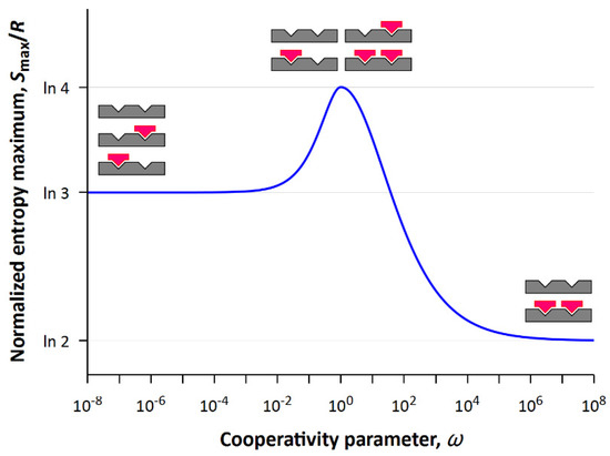 Representing the projection of the two-dimensional surface onto the (S, ω) plane, one can obtain the dependence of maximum values of entropy on the cooperativity parameter (see Figure 5). Obviously, the maximum of statistical entropy corresponds to the system with non-cooperative interactions (ω = 1) in which all four states are equally probable. As the cooperativity parameter () decreases, the state with completely filled lattice becomes less and less probable, and as the cooperativity parameter () increases, the states with a half-filled lattice become less and less probable.