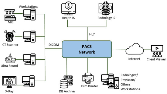 Contemporary hospitals implement electronic medical records and large information systems (IS), integrated by computer networks and software applications. There are different types of information systems. First, there is a hospital information system (HIS), which is a computerized management system for handling and supporting clinical operations, medical patient care activities, hospital’s business and administrative functions, etc. [1]. Also, there is a radiology information system (RIS) for the radiology department, which manages patient-related information (e.g., medical, patient demographics, and billing information), and examination-related information (e.g., patient arrival documentation, procedural descriptions, diagnostic reporting). The various IS exchange information by using the HL7 standard (https://www.hl7.org, accessed on 5 December 2021). In this scenario, an important part is the Picture Archiving and Communication Systems or the PACS infrastructure responsible of integrating the modalities. The latter, according to the standard, are medical image acquisition devices (such as CT scanners, MRI scanners, ultrasound, etc.); archives for storing medical images; workstations where radiologists and other practitioners view, re-process, and interpret the images; and printers for printing images [2] (Figure 1).