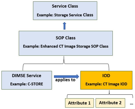 In DICOM, a service type is associated with the data (IODs) that it processes, and this is known as Service-Object Pairs (SOPs). Each SOP belongs to some SOP Class (Figure 2), such as Enhanced CT Image Storage SOP Class or Digital X-Ray Image Storage SOP Class (PS3.4). One or more SOP Classes related to a specific function that needs to be accomplished by communicating AEs is a Service Class Specification (e.g., Storage Service Class or Verification Service Class). This specification plays a central role in defining DICOM conformance for each AE. DICOM defines two types of SOP Classes, Normalized and Composite. For DIMSE Services, Normalized SOP Classes are defined as the union of a Normalized IOD and a set of DIMSE-N Services, while Composite SOP Classes are defined as the union of a Composite IOD and a set of DIMSE-C Services.