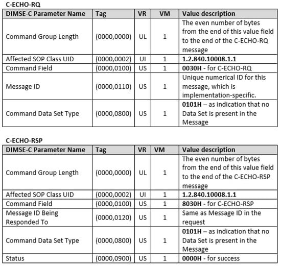 We can demonstrate how DICOM messages work with the simplest DIMSE service—C-ECHO service—by which one DICOM entity verifies that it is DICOM-connected with a peer DICOM entity. The SCU issues a C-ECHO request primitive (C-ECHO-RQ), for which an appropriate message (Figure 4) is constructed and sent to the SCP. Than the SCP issues a C-ECHO response primitive (C-ECHO-RSP), for which, an appropriate message is constructed (Figure 4) and sent back to the SCU. Each DIMSE service is identified by a predefined ID contained in the Affected Service Class UID value (e.g., 1.2.840.10008.1.1. for C-ECHO service). Each DICOM message type is identified by predefined ID contained in the Command Field value (e.g., 0030 for C-ECHO-RQ and 8030 for the C-ECHO-RSP). C-ECHO service is a part of the Verification SOP Class (without IOD data), which is a part of the Verification Service Class.