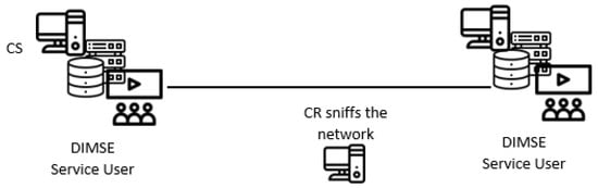 In the DPassive submodel, a CR is any device that passively analyzes the network traffic (see, Figure 6 for a sketch). The SCU AE or the SCP AE (as CS) can hide the secret message into the normal DIMSE service flow, while the CR can sniff the network traffic to intercept the DICOM messages, and extract the secret message. Concerning the scenario, the hidden communication attempt can be implemented within the hospital or medical facility.