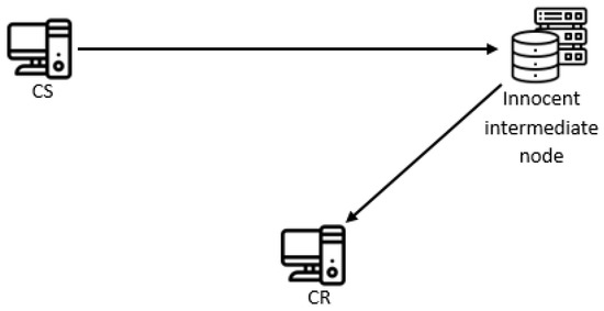 An indirect covert channel can be created based solely on the C-MOVE service, by which SCU asks an SCP (e.g., an archive) to send all Composite SOP instances that match the identifier to the third party AE (its AE Title is a value of the C-MOVE-RQ’s Move destination parameter). In this system model, C-MOVE SCP is an innocent intermediate node, the SCU is CS, while the third party AE is the CR (Figure 7). In reality, the third party AE is usually the SCU itself. For this to work, the intermediate node needs to know the IP address and the port of the third party AE, so it can map the given AE Title to them.