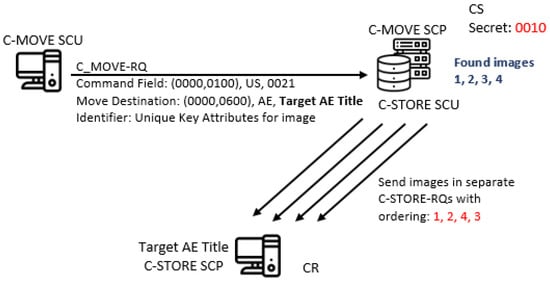 So, one can hide bits in the order of the consecutive C-STORE-RQ messages for all found n images, by using their UIs for ordering in the specific pattern (CC2). For example, let UIs for four found images are 1, 2, 3 and 4 for simplicity, and if we choose the sequence 0010 to be represented with the pattern 1243, then sending this sequence corresponds to sending images in order 1, 2, 4 and 3. For this covert channel, the covert sender is the C-GET SCP (C-MOVE SCP), while the covert receiver is the C-GET SCU (other AEs specified by the C-MOVE SCU, see Figure 8). This covert channel is a form of the pattern EN2 (“Elements/Features Positioning”).