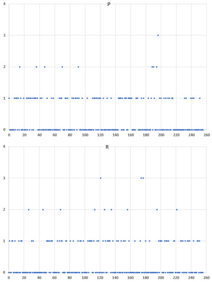 Figure 13 plots the frequency distribution of the 8-bit Message ID half values for regular traffic for two datasets, P and R. One can notice that there are quite similar.