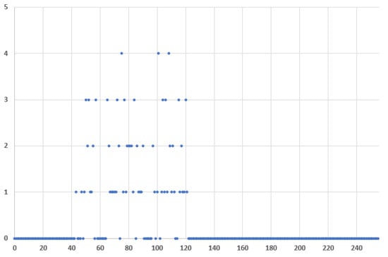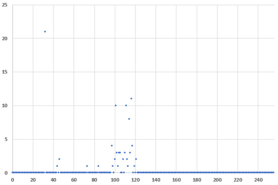 Figure 14 and Figure 15 plot the frequency distribution of the 8-bit Message ID half values for covert traffic with ASCII characters and encrypted with AES block cipher, respectfully. The difference in the first case from the regular traffic is more obvious, than in the second case when AES is used.