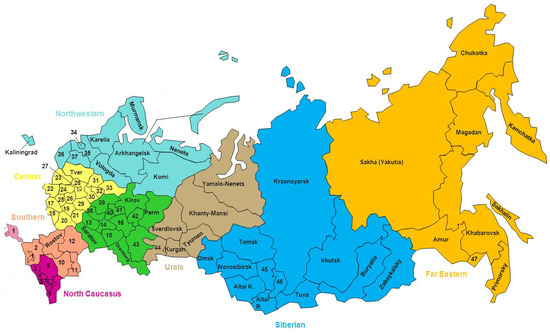 Russia is a federal state governed from a single center on the basis of a unified legislation. The Russian Federation unites 85 subjects (82 territories and 3 cities of federal subordination) (Figure 2). The constituent entities of the Russian Federation are united in eight Federal Districts: Central, Northwestern, Southern, North Caucasian, Volga, Ural, Siberian, and Far Eastern. The best climate, maximum population density, and, accordingly, better living conditions are typical for the Central and Southern Federal Districts. The Ural Federal Districts, Siberian Federal Districts, and Far Eastern Federal Districts encompass territories with a harsh climate; low population density and low degree of socio-economic development of the territories are quite consistent with very harsh living conditions.