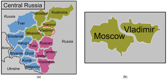 Geographical location of the compared Russian regions. (a) Central Federal District of the Russian Federation; (b) Geographically adjacent Moscow and Vladimir regions.