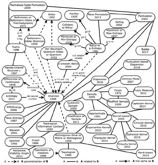 The central place in it is occupied by Shannon entropy or information entropy [40]. It is information entropy that today dominates among other entropies. Statistical analysis by the team of authors M. Ribeiro et al. [39] showed that, in total, articles published in the Scopus peer-reviewed journals mention Shannon information entropy 34,751 times, which is about 49.2% of the total number of mentions of 40 other types of entropy (70,495 in total). Perhaps, the same conclusion can be made by visually assessing the central localization of Shannon entropy in the diagram in Figure 4 and the number of logical connections between Shannon entropy with other types of entropy.
