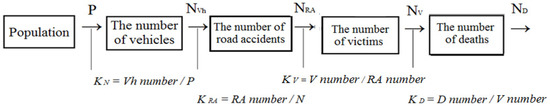 Formalization of the concept of “Road accident rate” in terms of the process description leads us to a cause–effect 4-link chain «Population (P)—The number of vehicles (NVh)—The number of road accidents (NRA)—The number of victims (NV)—The number of deaths (ND)» [49] (Figure 5).