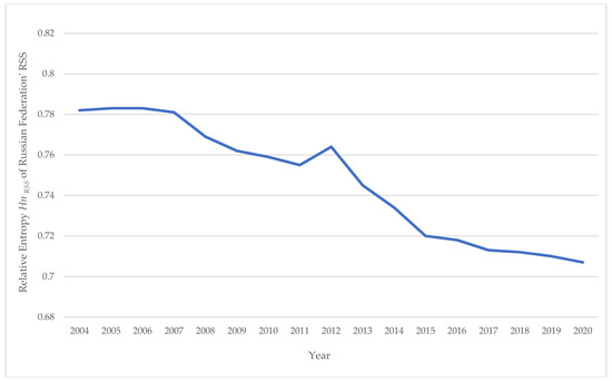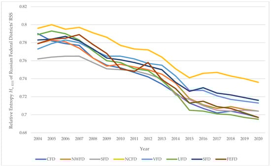 Time series (2004–2020) of the values of the relative entropy Hn RSS of the Federal Districts of the Russian Federation.