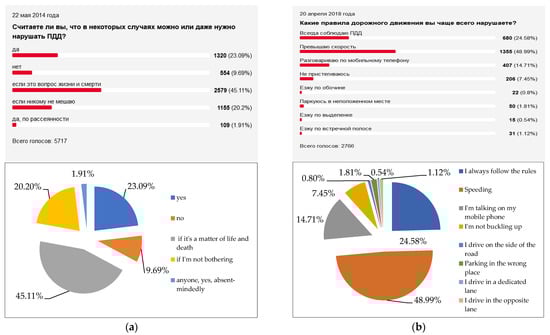 The results of opinion polls regarding the compulsory observance of the road traffic rules by Russian drivers [54]. (a) Results as of 22.05.2014 (N = 5717) % of total loyalty to traffic rules = 9.69%. (b) Results as of 20.04.2018 (N = 2766) % of total loyalty to traffic rules = 24.58%.