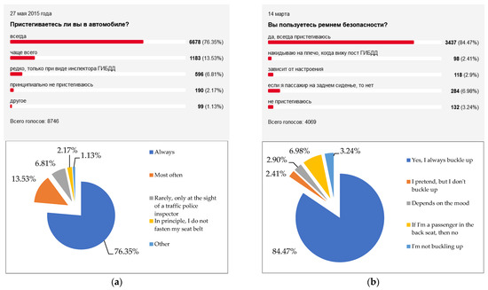 The results of opinion polls regarding the use of seat belts by Russian drivers [54]. (a) Results as of 27.05.2015 (N = 8746) % of belt users = 76.35%. (b) Results as of 14.03.2019 (N = 4069) % of belt users = 84.47%.