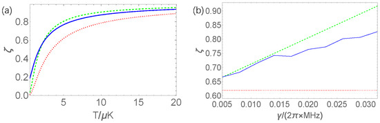 (a) The quantities , and vs. the temperature T, where , and are represented by the blue solid, green dashed, and red dotted curves, respectively. In our simulation, the parameters are chosen as MHz, MHz/μs, MHz, and μs. (b) The corresponding quantities in (a) vs. the coupling strength . The temperature is chosen to be μK, and the other parameters are the same as those in (a).