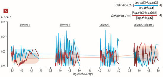 Each geodesic in the universe was coarse-grained by a factor k (jumping from one event to the next kth event). Then, we constructed a universal dendrogram from all coarse-grained geodesic events. Figure 2A shows values for each of the universes (1–3), the , and ratio compared to the same log-ratios of the physical constants determined experimentally upon increasing the size of the universal dendrogram. We note that in different units, the selection of the log-ratios of the physical constants determined experimentally had different values. We show that the scaling of regular units corresponded to power scaling of the full dendrogram. Thus, when we use the Kg-m-s units, we multiply each by 21 while in the kg-cm-s () we multiply each by 220.