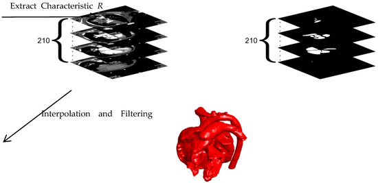 where C1 is the value relevant to the grayscale of the extracted object in the CT images. I is the grayscale of the image with the range of 0–1. R represents the dimensionless characteristic of the extracted object with the range of 0–1. To accelerate the image extraction, the value of R > C2 is set to 1 after each iteration. In this research, C2 is chosen as 0.7. At the end of the extraction, the inner wall boundary of the heart is obtained by the 0.5 contours of R. According to the scale, the extracted inner wall boundaries are integrated into a complete heart after interpolation and filtering. The whole reconstruction process of the 3D cardiac model is shown in Figure 1.