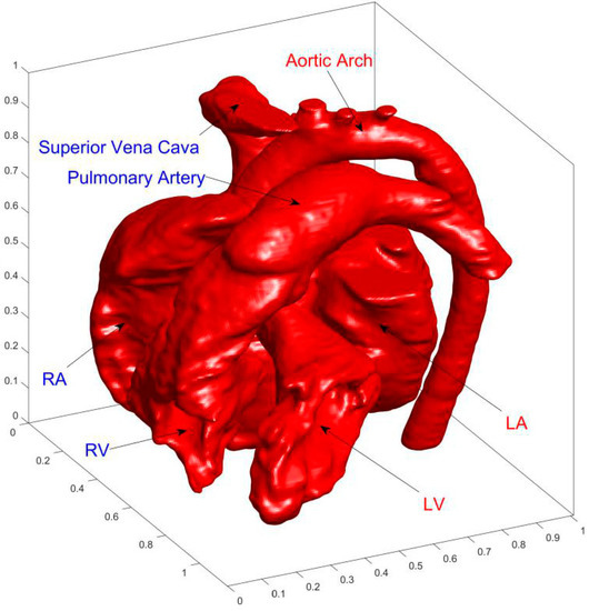 Hemodynamic data can be obtained from imaging examinations, such as cardiac catheterization, echocardiography, computed tomography (CT), magnetic resonance imaging(MRI), etc. However, all these examinations have certain limitations. Cardiac catheterization can accurately measure the pulmonary artery pressure and hemodynamic data. However, it is an invasive examination [9]. Serious complications may occur during pre- and post-operation. In addition, it is expensive and with radiation. Echocardiography provides non-invasive imaging data in pediatric cardiology and with a low cost of inspection [10]. Echocardiography can visualize complicated flow with a heart chamber or valve motion, however, with limitations in temporal and spatial resolutions. A cardiac CT scan is an important low-invasive diagnostic tool for the evaluation of congenital heart disease in children. The main drawback of CT is the cumulative radiation dose from repeat examinations pre- and post-operation or endovascular treatment [11]. Cardiac MRI is superior to CT and echocardiography, as well as hemodynamic assessment by cardiac catheterization. The main limitation of MRI is the relatively long scan duration for the required spatiotemporal resolution [12]. With the rapid development of computer and medical image processing technology, computational fluid dynamics (CFD) has become an important tool for studying blood flow dynamics. CFD is noninvasive. It can provide quantitative analysis and qualitative visualization of many crucial hemodynamic parameters such as velocity, pressure, and blood oxygen content in hemodynamic studies [13]. CFD simulations of cardiac flow in the whole heart with ASD or VSD have rarely been reported due to the complex geometric boundary. The complex geometric properties of the cardiovascular system and the complex circulations also lead to the problems such as the reconstruction of the 3D cardiac model [1,14], large deformation of the heart, and the flow in the systemic/pulmonary circulations. The solution to these problems is of great significance for the simulation of cardiac flow and the diagnosis of disease.