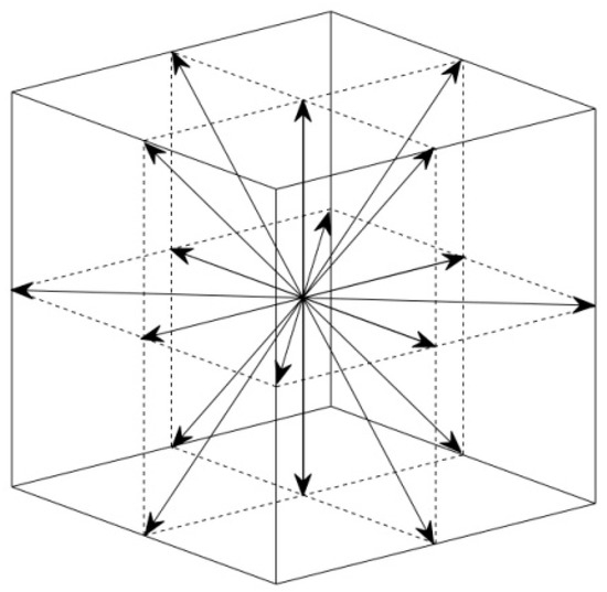 Schematic of the discrete velocities in D3Q19 model. 18 non-zero discrete velocities and a zero discrete velocity.