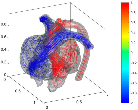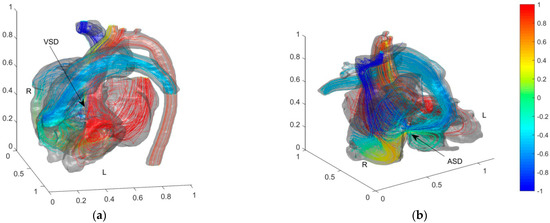 Blood flow and blood oxygen content distribution in the heart of the preoperative child with ASD and VSD. Color of streamlines represents the dimensionless blood oxygen content. Red for relative high oxygen content and blue for relative low blood oxygen content. (a) Front view of VSD; (b) Front view of ASD.