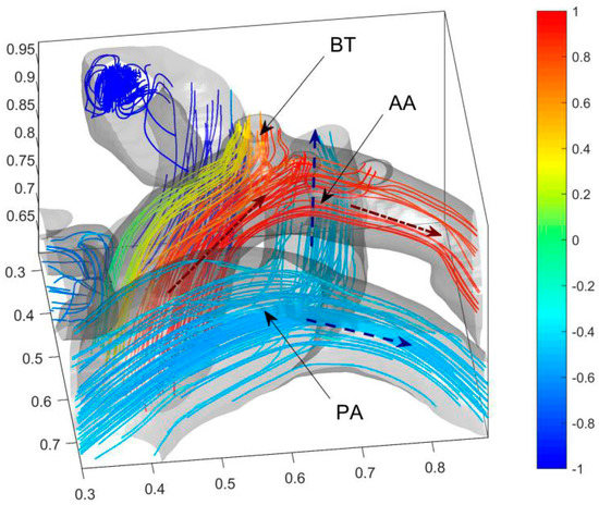 Blood oxygen content distribution of AA and three arterial outlets of the child. Blue dashed arrows (--) represent the directions of the veinal blood and the red dash-dot arrow (-) represents the direction of the arterial blood. The acronym BT, AA, and PA represent the brachiocephalic trunk, aortic arch, and pulmonary artery, respectively.