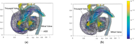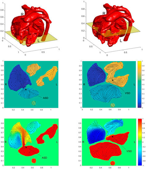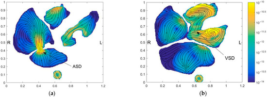 Congenital heart disease (CHD), having a high incidence (about 0.8–1.2% of newborns) in China and the United States, becomes one of the main diseases affecting the survival rate of newborns [1,2]. As one of the main causes of CHD, the septal defect can be divided into the atrial septal defect (ASD) and ventricular septal defect (VSD) according to the location of the septal defect [3,4]. The septal defect causes abnormal changes in hemodynamics, precordial pain, and fatigue of the patient. The severe patients are prone to growth retardation, pale complexion, shortness of breath, cyanosis of the skin, and even premature death [5]. In order to analyze the cardiac flow and to understand the impact of the septal defect, the flow process was visualized by experiments and numerical simulations [6,7,8].